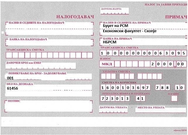 Врз основа на Одлуката за присуство на наставата на студентите на Економскиот факултет – Скопје, бр.02-1500/13 од 8.10.2024 година, ве информираме дека при уплатата за реализација на нереализирана настава, во уплатницата задолжително треба да се наведат следните информации: