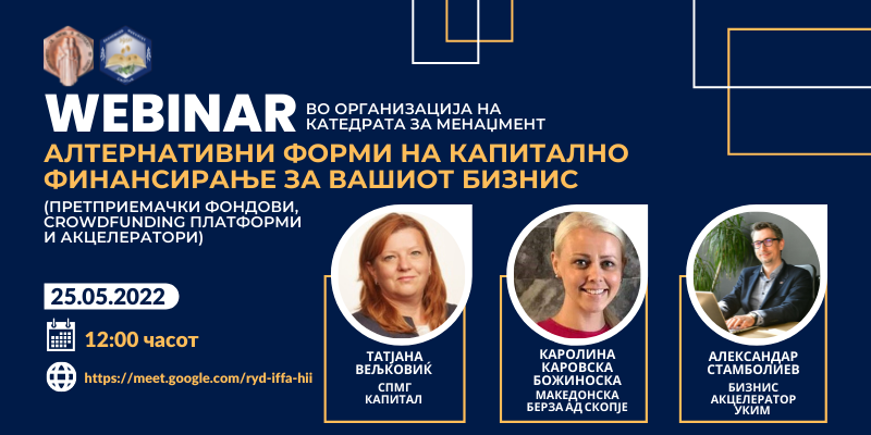 Имаме огромно задоволство да ве поканиме на настанот во организација на Катедрата за менаџмент на тема алтернативни форми на капитално финансирање кој ќе се одржи на 25мај 2022 (среда) со почеток во 12:00 часот.